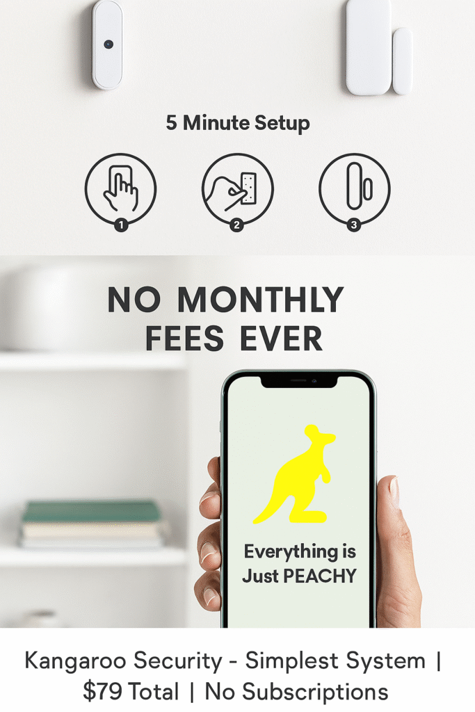 Minimalist appeal: If you just want door/window sensors and motion detection with phone alerts, Kangaroo delivers without complexity or ongoing costs. Setup takes about 5 minutes.