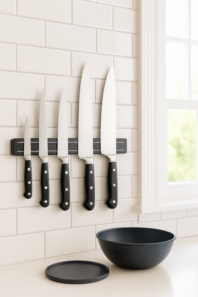 Space-saving benefit: Utilizes vertical wall space instead of valuable drawer real estate. The Spruce Eats recommends magnetic strips as essential for compact kitchen organization.