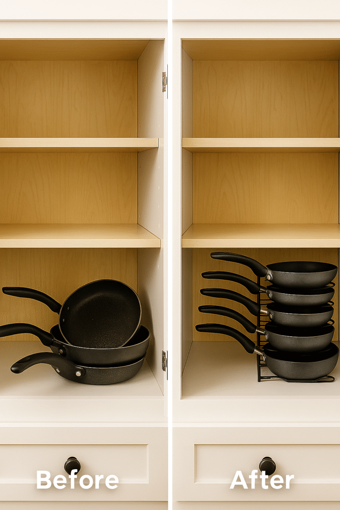 Space-saving benefit: Utilizes vertical cabinet space, fitting 6-8 pans in the space of 3.