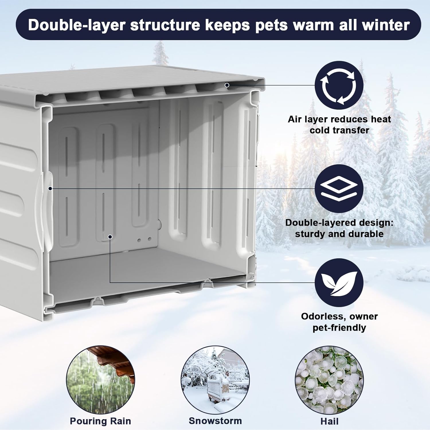 Q: Will this waterproof dog house work in extremely hot climates? A: The insulation that retains heat in winter also provides cooling protection in summer. However, in climates regularly exceeding 90-95°F, ensure adequate shade placement and ventilation. The removable insulated liner can be taken out during extreme heat for better airflow.