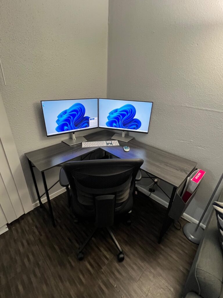 A: Yes, the desk comfortably supports two 24-inch monitors, though placing both on the corner joint may cause slight flex. For optimal stability, position one monitor on each arm of the L-shape.