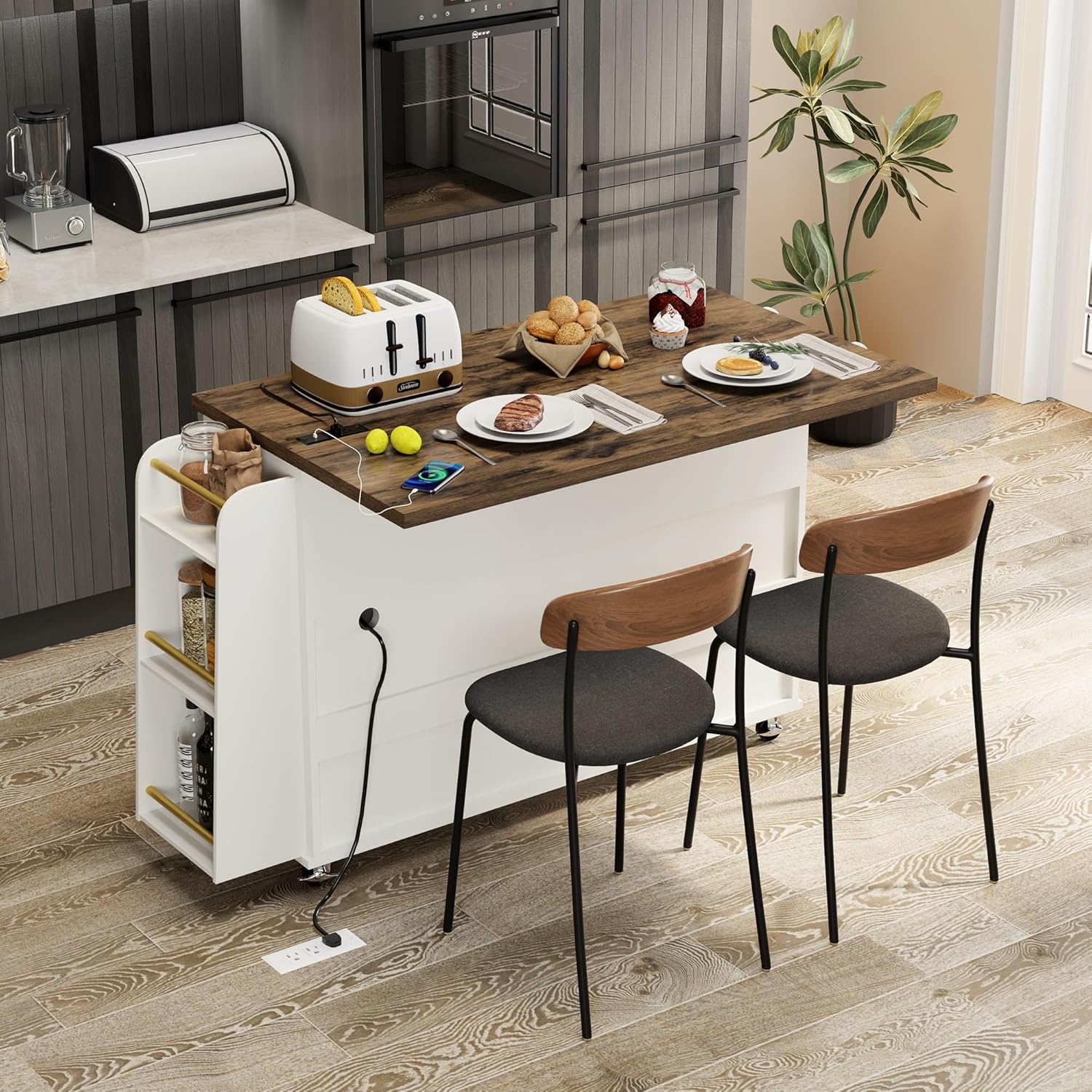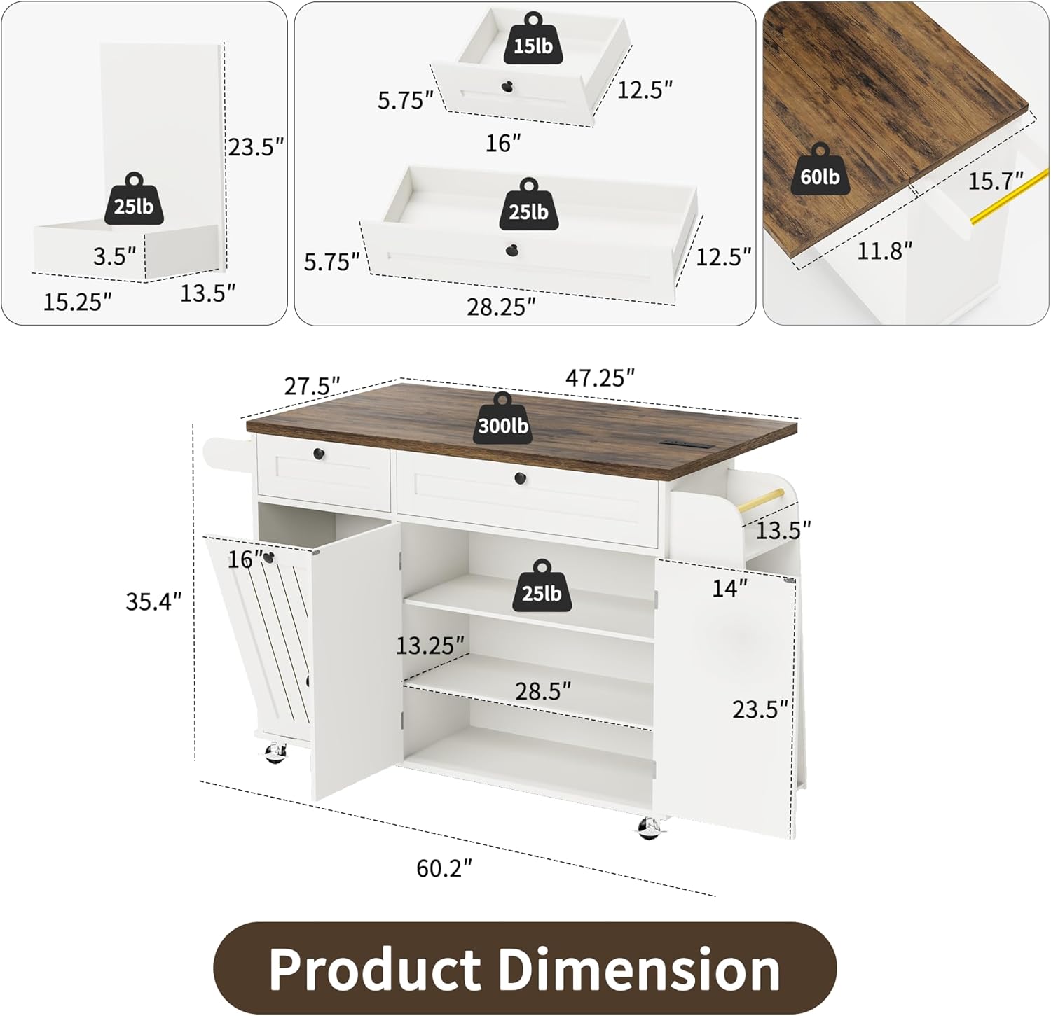 The Cibert 60.2" Rolling Kitchen Island transforms your kitchen with an expandable countertop (holding up to 300lb), built-in power outlets with USB charging ports, and smart storage solutions including a hidden trash can compartment, deep drawers, and spice racks. This mobile island on wheels features 360° lockable casters for easy repositioning, making it the perfect space-saving solution for meal prep, entertaining, and keeping your kitchen organized and clutter-free.