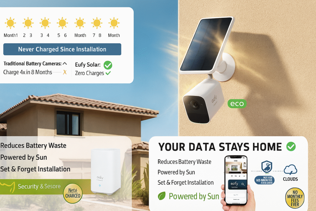 Eufy’s solar-powered option eliminates battery anxiety entirely. The integrated solar panel provides continuous charging—I’ve run mine for 8 months without touching it.